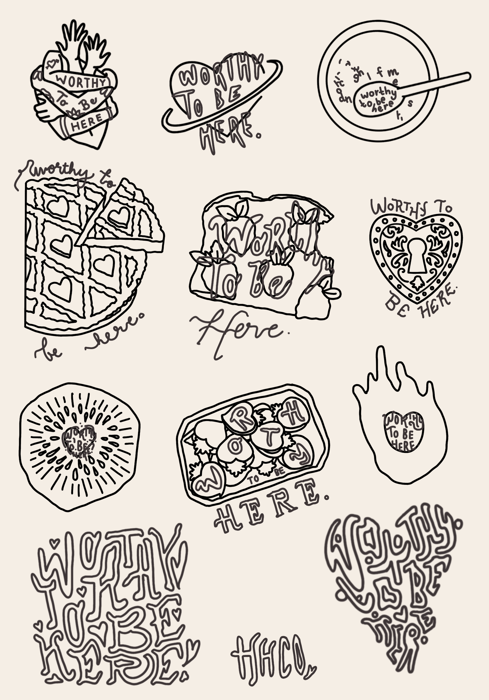 Taking inspiration from the heart symbol and overall messaging of connected-ness and love for yourself and others, the sketches below, portray how this symbol can be universally discovered in everyday things we may not appreciate or be aware of on a day-to-day basis.Because of the overwhelming support and engagement from the collection, as well as socials, Ashley proposed ideas for an exclusive HHCo. patch and sticker packaged with every order, featuring her slogan, while adhering to the color palette and bringing awareness to not being so hard on ourselves because at the end of the day, we’re all humans just trying to do our best.